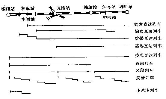 ⑧ 摘挂列车。在技术站编组,在区段内各中间站进行车辆摘挂作业,服务于区段管内车流输送的列车。